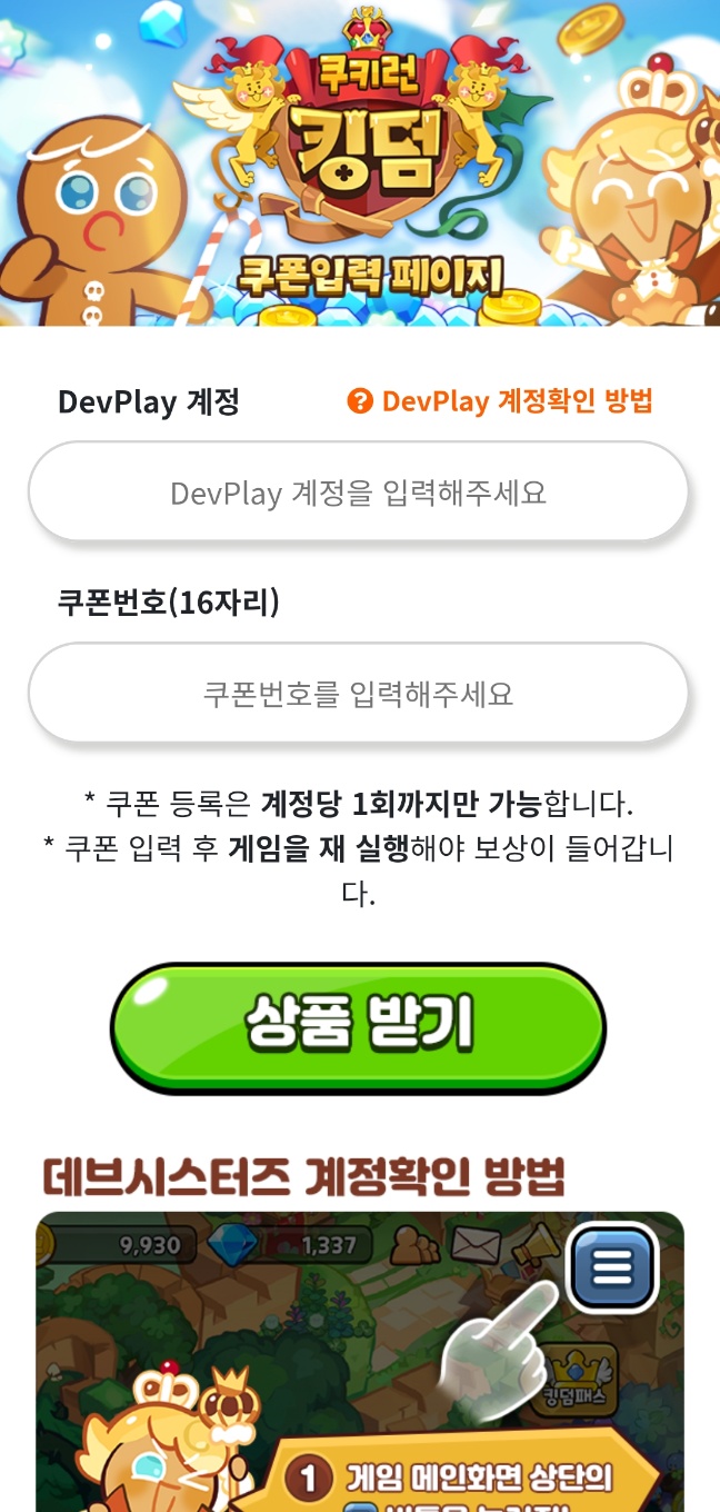 쿠킹덤 쿠폰 등록을 위해서는 먼저 DevPlay 아이디를 확인해줘야 한다