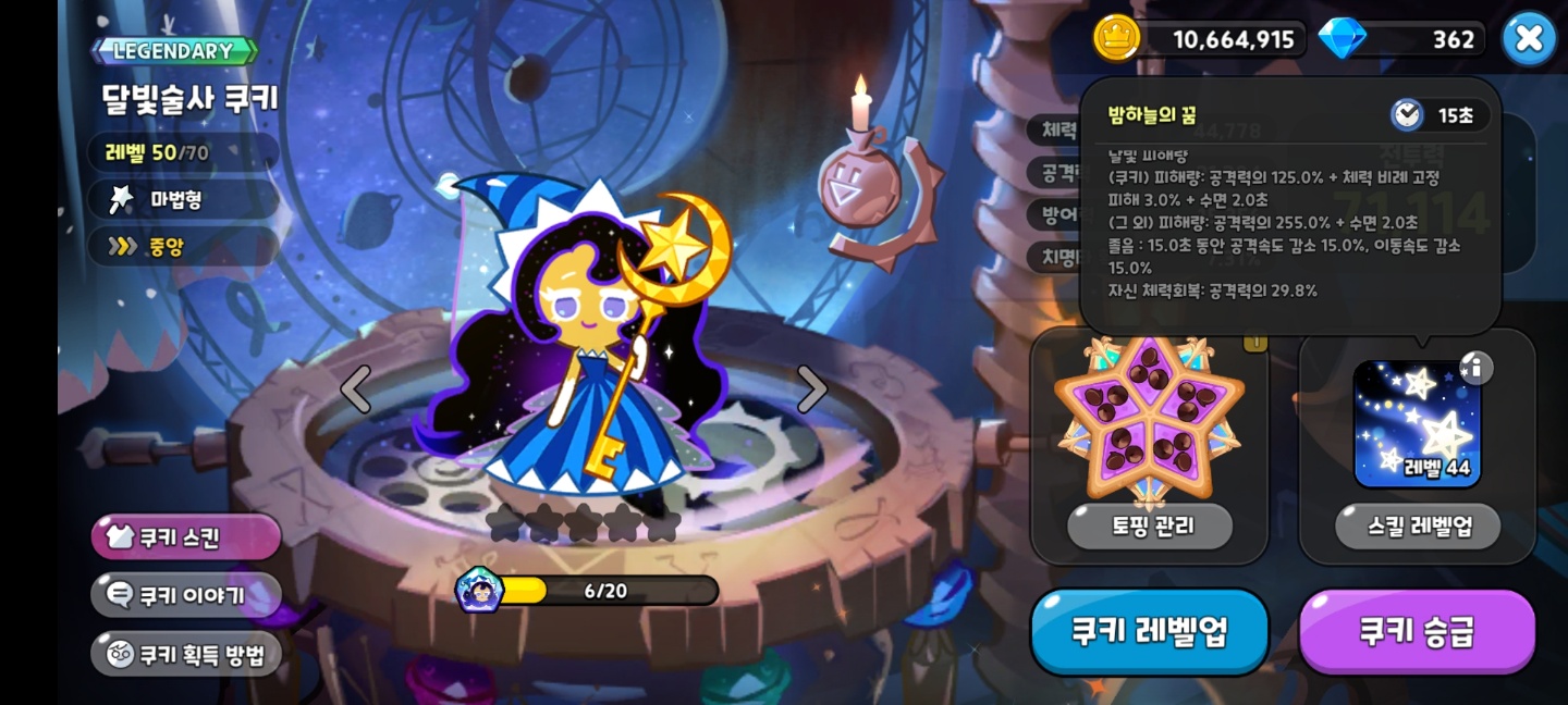 밤하늘의 별들이 쏟아지며 적들에게 피해증가 디버프를 걸고 피해를 입힌다. 이후 달빛이 환하게 빛나며 적들에게 달빛 피해를 주고 수면을 건다. 수면이 걸리지 않은 적은 졸음상태가 되고 대상이 수면이 걸릴 수 있는 상태가 될 때 졸음이 수면으로 발동한다. 달빛술사는 꿈에서 깨어날 때 자신의 체력을 회복하며 적이 거는 수면을 이롭게 받아들여 수면이 종료되면 자신의 체력을 회복한다. 꿈을 꾸는 달빛술사 쿠키는 꿈의 잠식에 걸리지 않는다. (최대 체력 비례 피해 상한선 : 300,000)