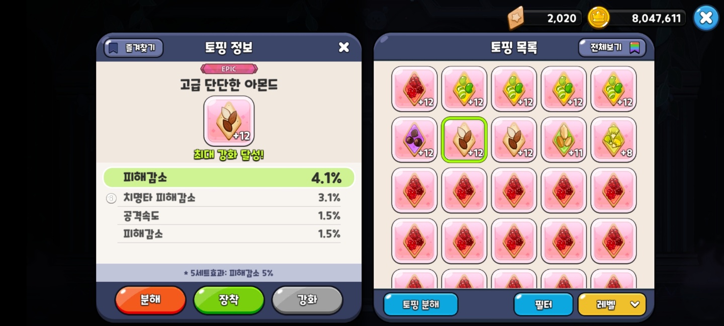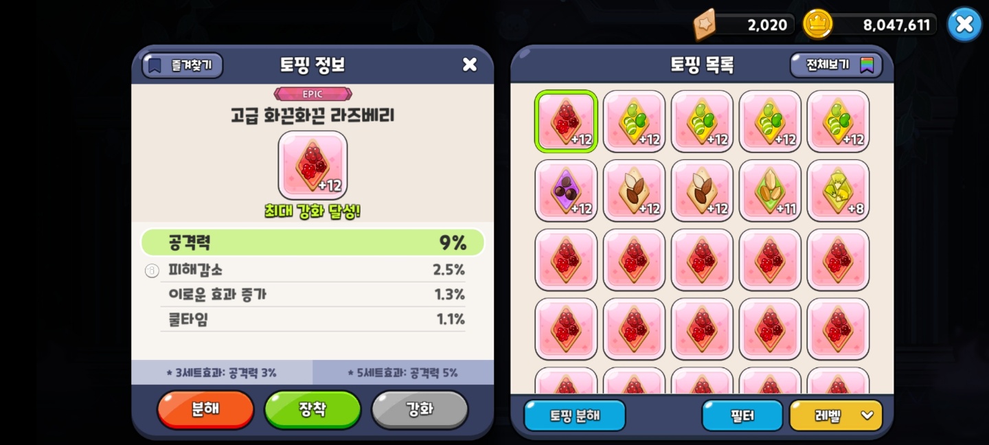 라즈베리와 비슷하지만 치명타 확률을 높여주는 애플젤리 토핑도 좋다