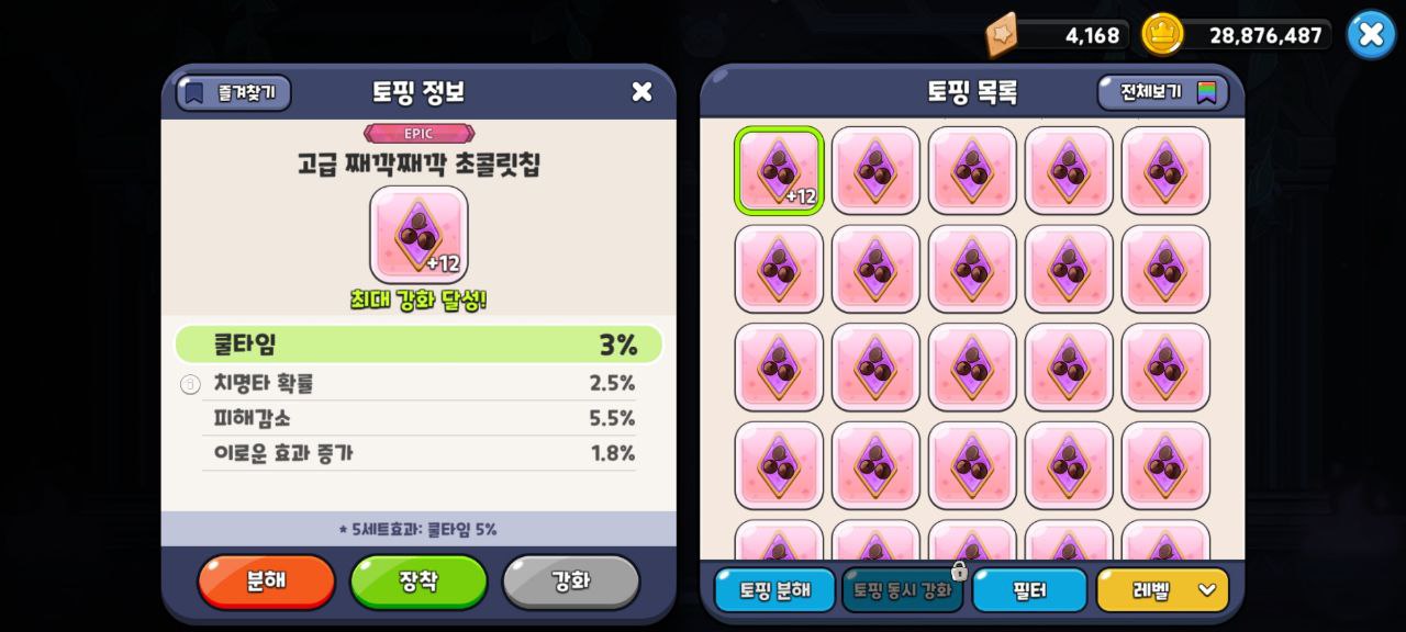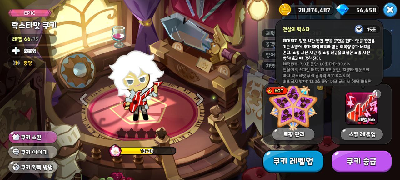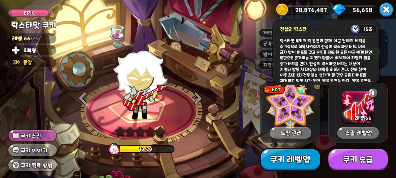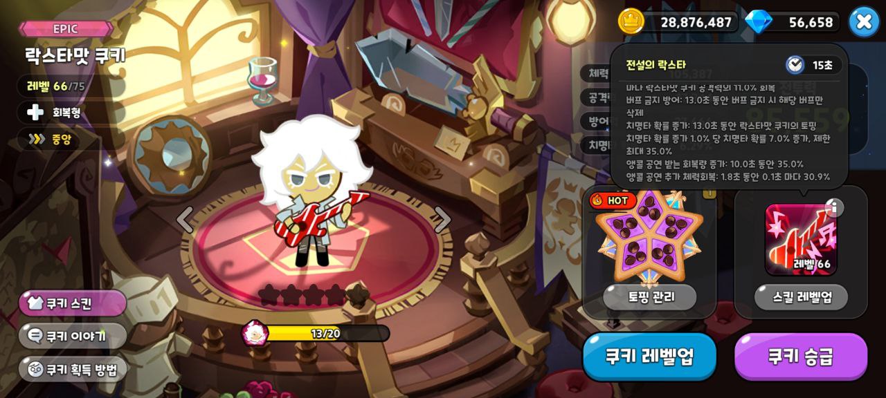 치명타 확률 증가 : 13.0초 동안 락스타맛 쿠키의 토핑 치명타 확률 증가 1.0% 당 치명타 확률 7.0% 증가, 제한 최대 35.0%