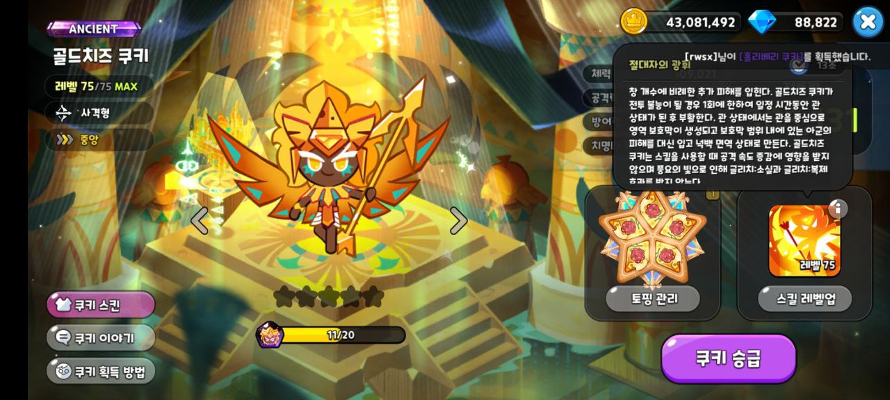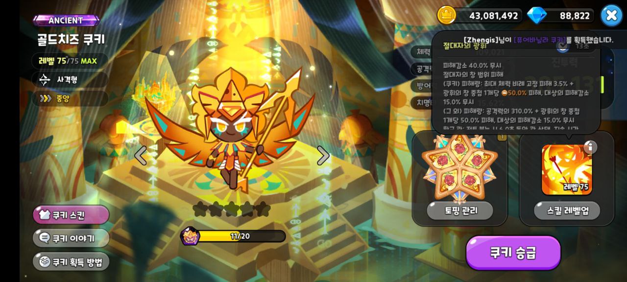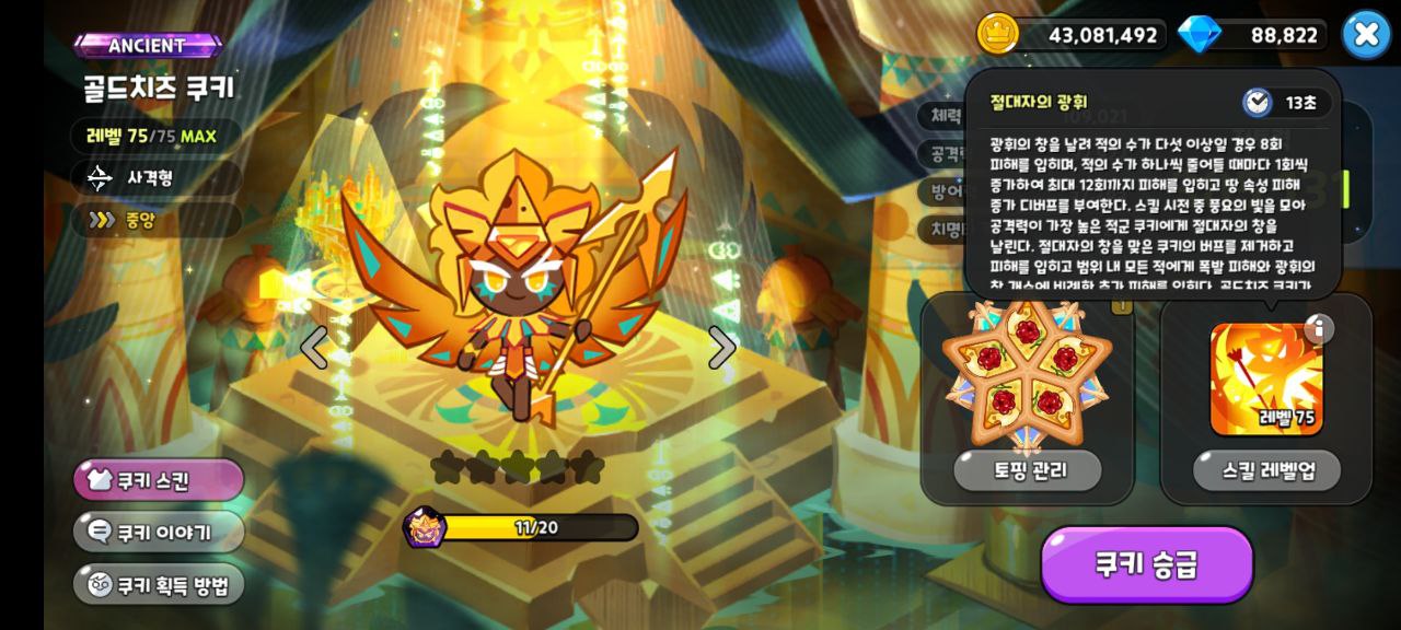 - 황금 관 능력치 : 골드치즈 쿠키의 공격력 150.0%, 체력 200.0%, 방어력 185%, 피해감소 100.0%