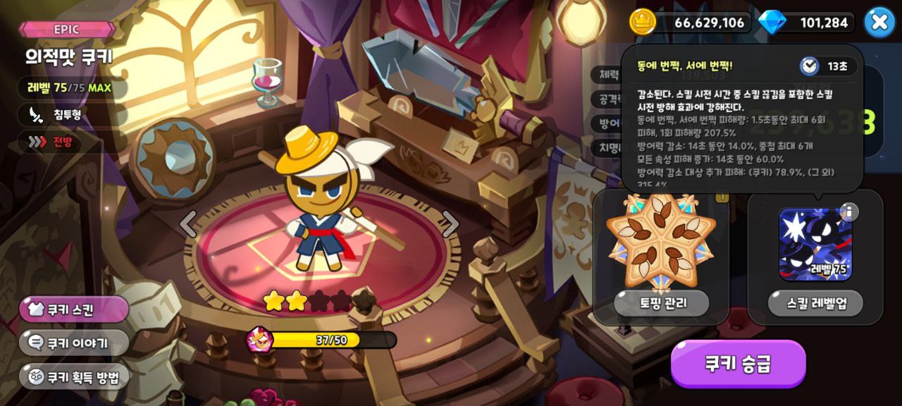 - 방어력 감소 대상 추가 피해 : (쿠키) 78.9%, (그 외) 315.4%