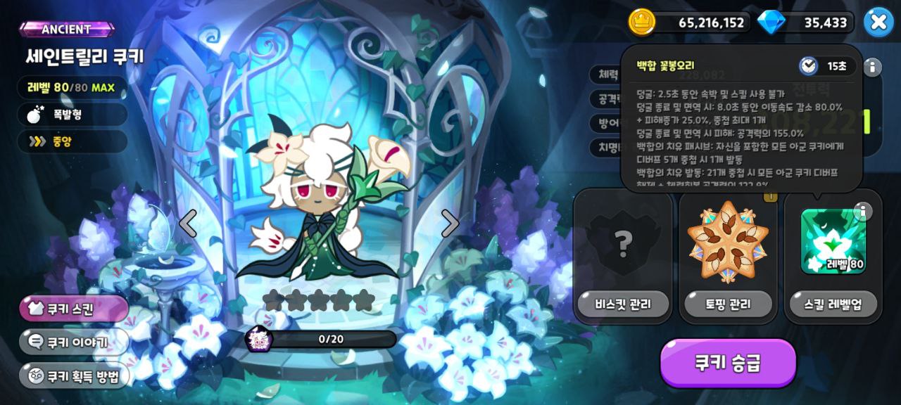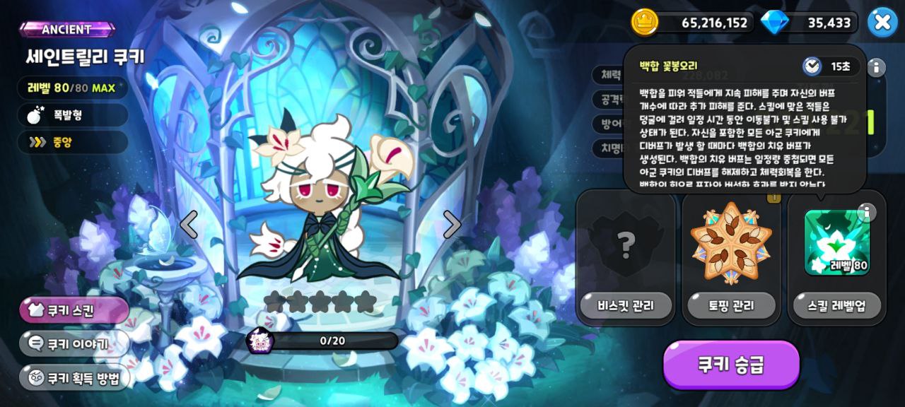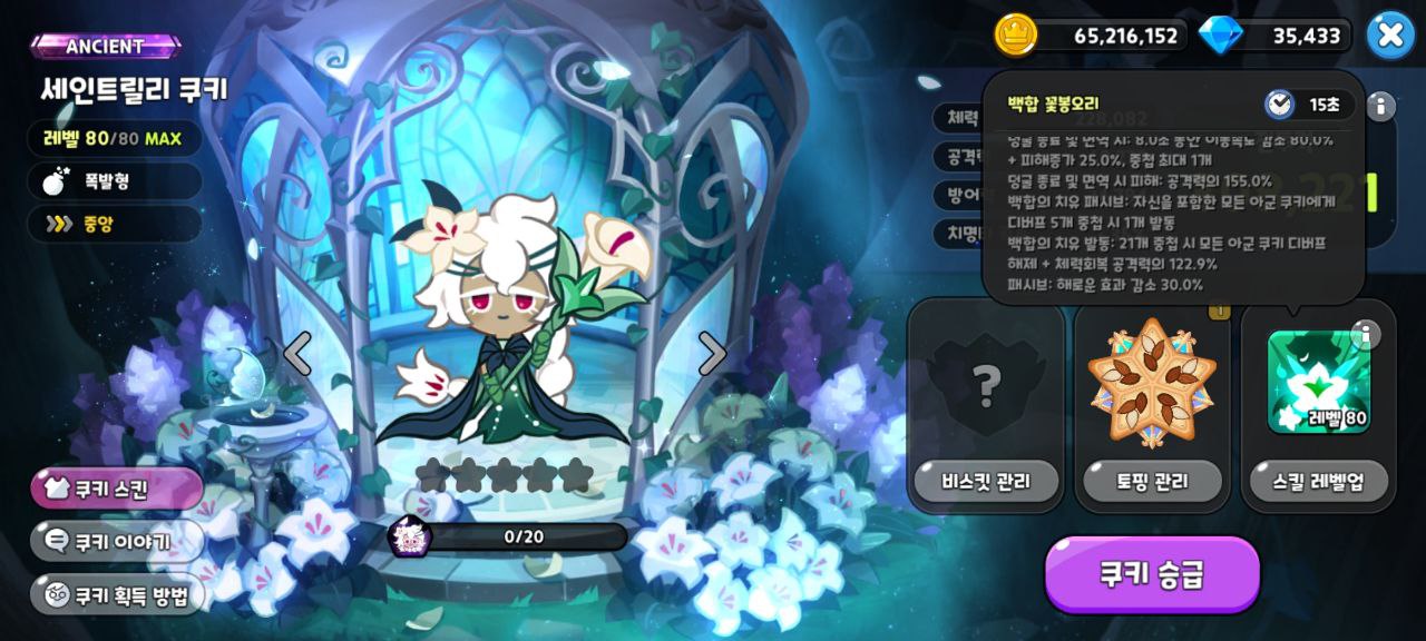 - 백합의 치유 발동 : 21개 중첩 시 모든 아군 쿠키 디버프 해제 + 체력회복 공격력의 122.9%