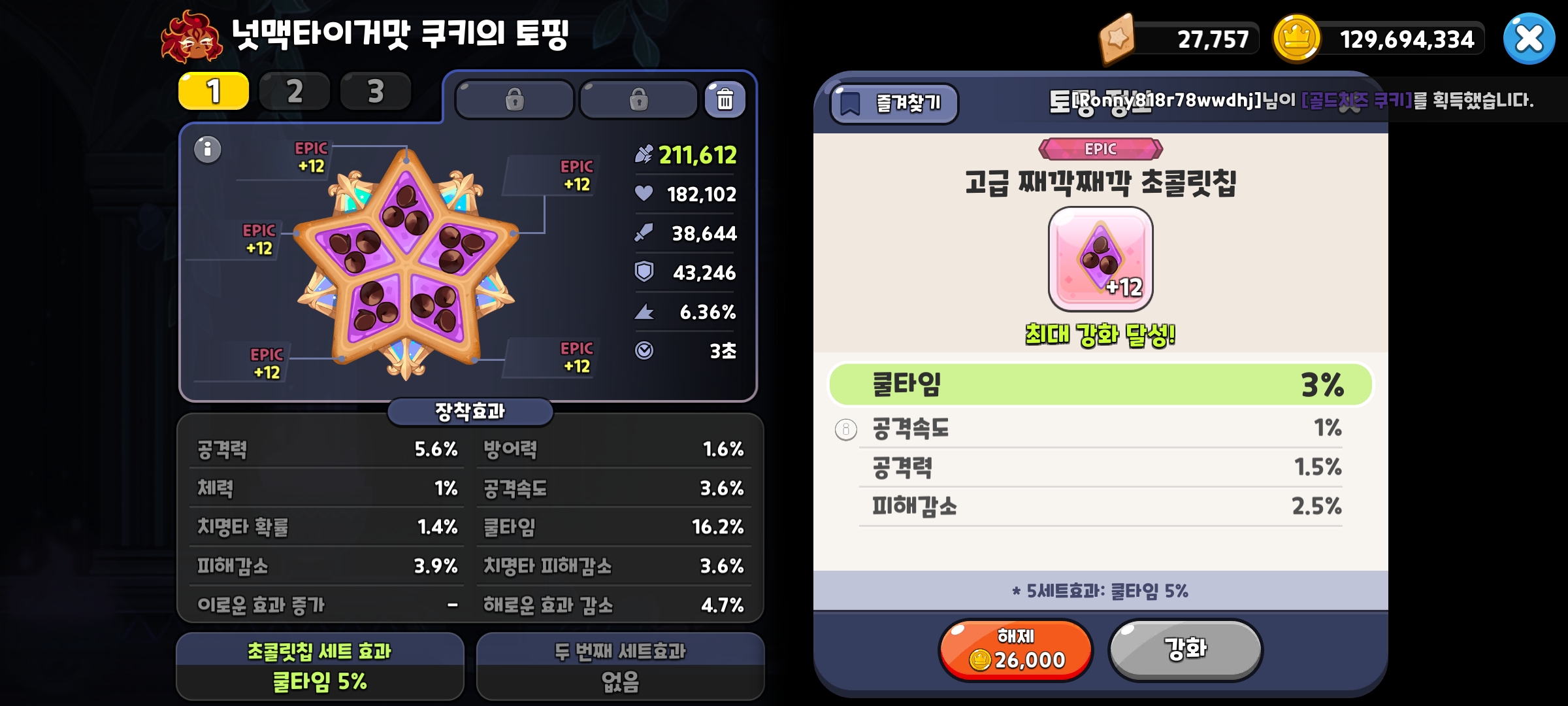 지원형 쿠키에 맞춰서 초콜릿칩으로 쿨타임을 줄였다
