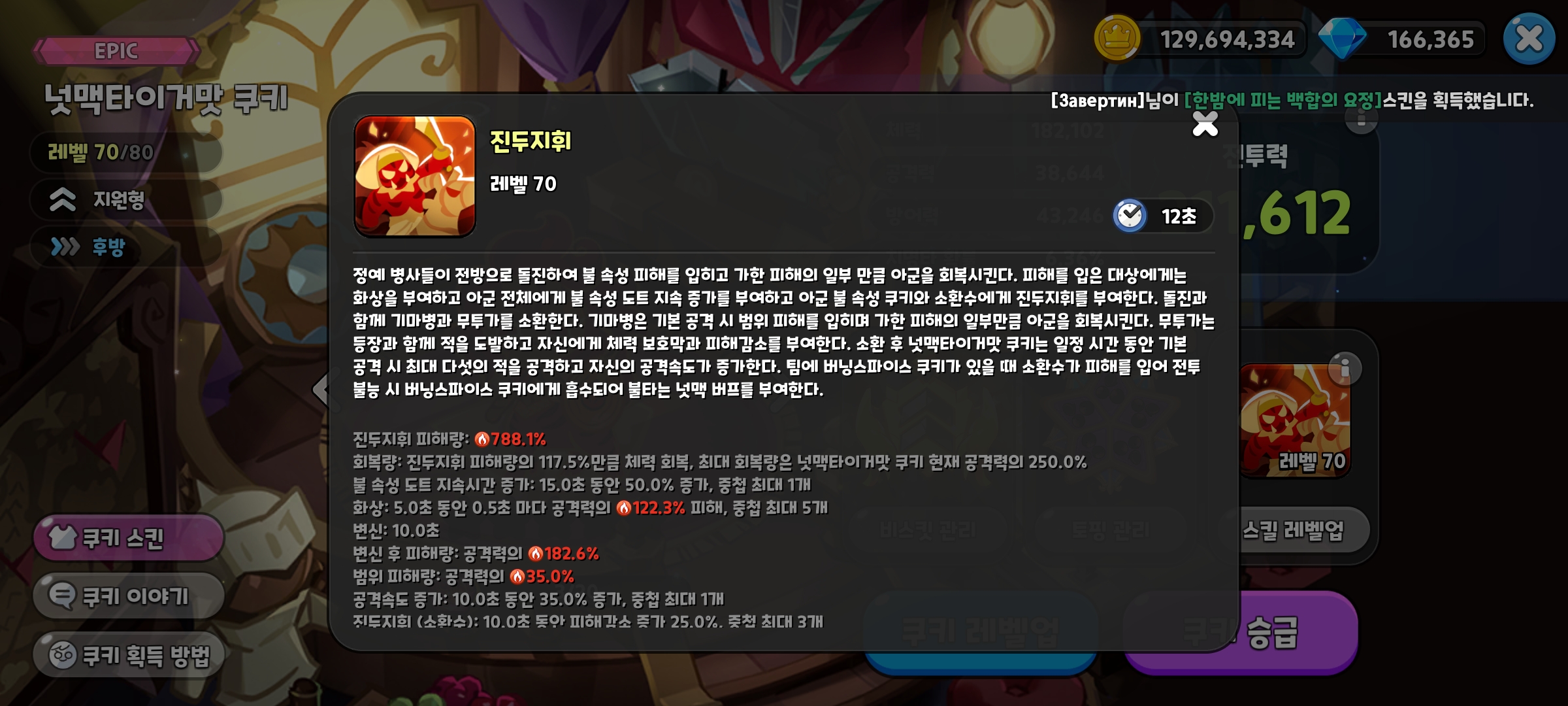 - 회복량 : 진두지휘 피해량의 117.5% 만큼 체력 회복, 최대 회복량은 넛맥타이거맛 쿠키 현재 공격력의 250.0%