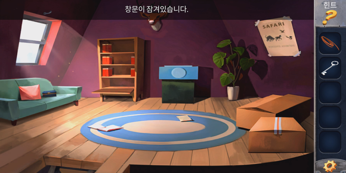 이제 다시 위층으로 와서 창문을 열쇠로 열고
