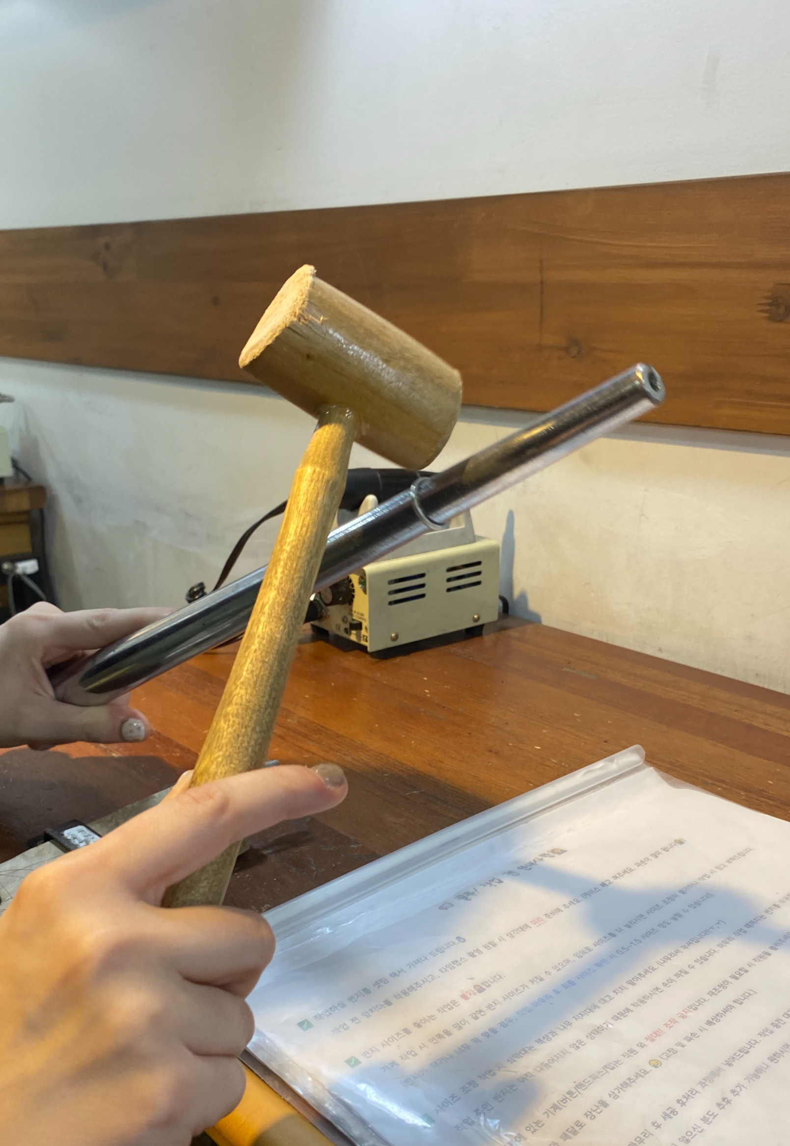 나무망지로 두들겨서 반지를 크게 만들어 주는 작업으로 시작한다