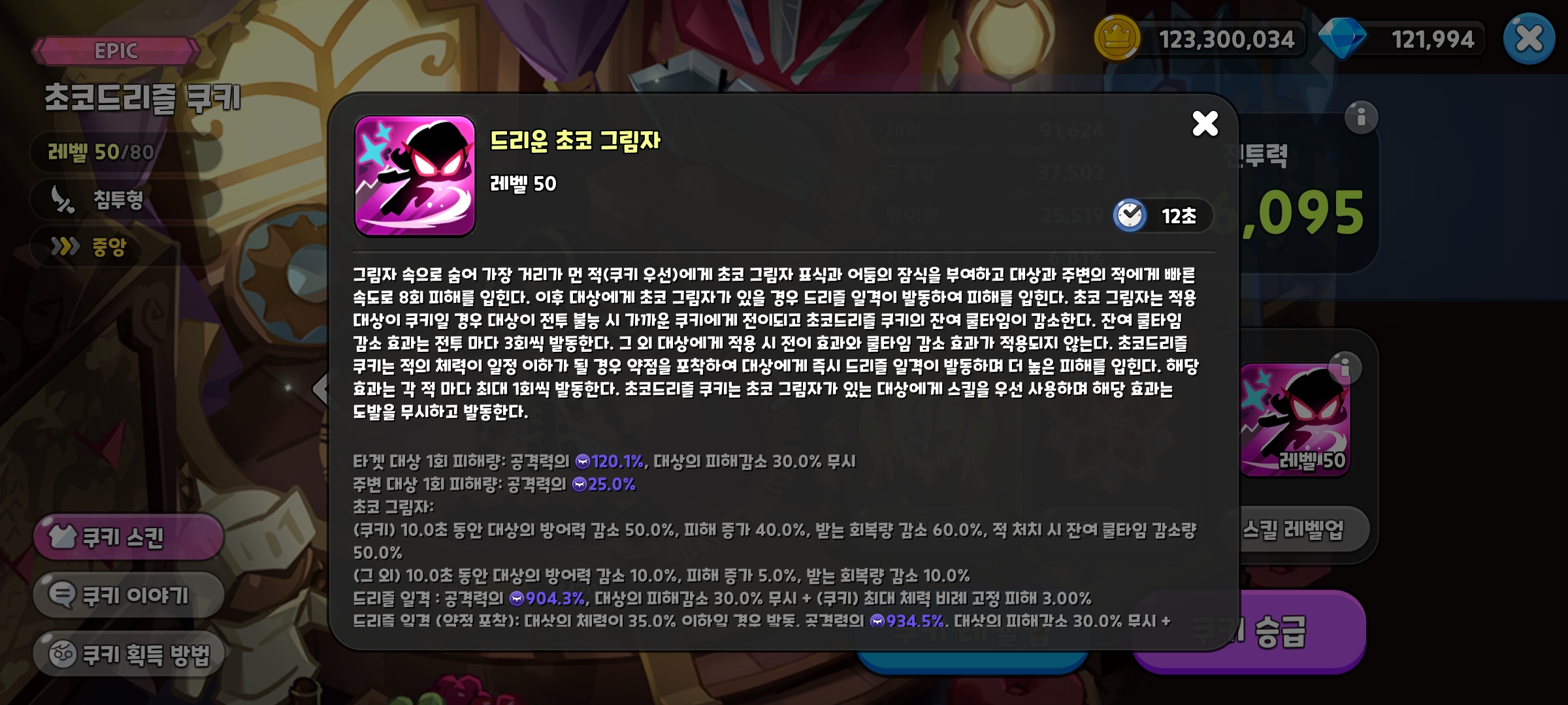 그림자 속으로 숨어 가장 거리가 먼 적(쿠키 우선)에게 초코 그림자 표식과 어둠의 잠식을 부여하고 대상과 주변의 적에게 빠른 속도로 8회 피해를 입힌다. 이후 대상에게 초코 그림자가 있을 경우 드리즐 일격이 발동하여 피해를 입힌다. 초코 그림자는 적용 대상이 쿠키일 경우 대상이 전투 불능 시 가까운 쿠키에게 전이되고 초코드리즐 쿠키의 잔여 쿨타임이 감소한다. 잔여 쿨타임 감소 효과는 전투 마다 3회씩 발동한다. 그 외 대상에게 적용 시 전이 효과와 쿨타임 감소 효과가 적용되지 않는다. 초코드리즐 쿠키는 적의 체력이 일정 이하가 될 경우 약점을 포착하여 대상에게 즉시 드리즐 일격이 발동하며 더 높은 피해를 입힌다. 해당 효과는 각 적 마다 최대 1회씩 발동한다. 초코드리즐 쿠키는 초코 그림자가 있는 대상에게 스킬을 우선 사용하며 해당 효과는 도발을 무시하고 발동한다.