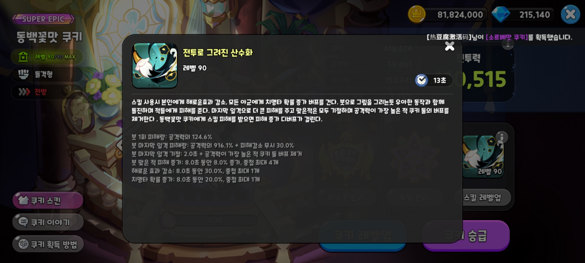 - 붓 마지막 일격 기절 : 2.0초 + 공격력이 가장 높은 적 쿠키 둘 버프 제거