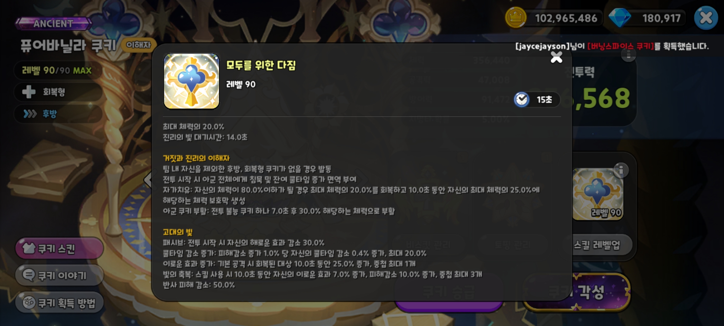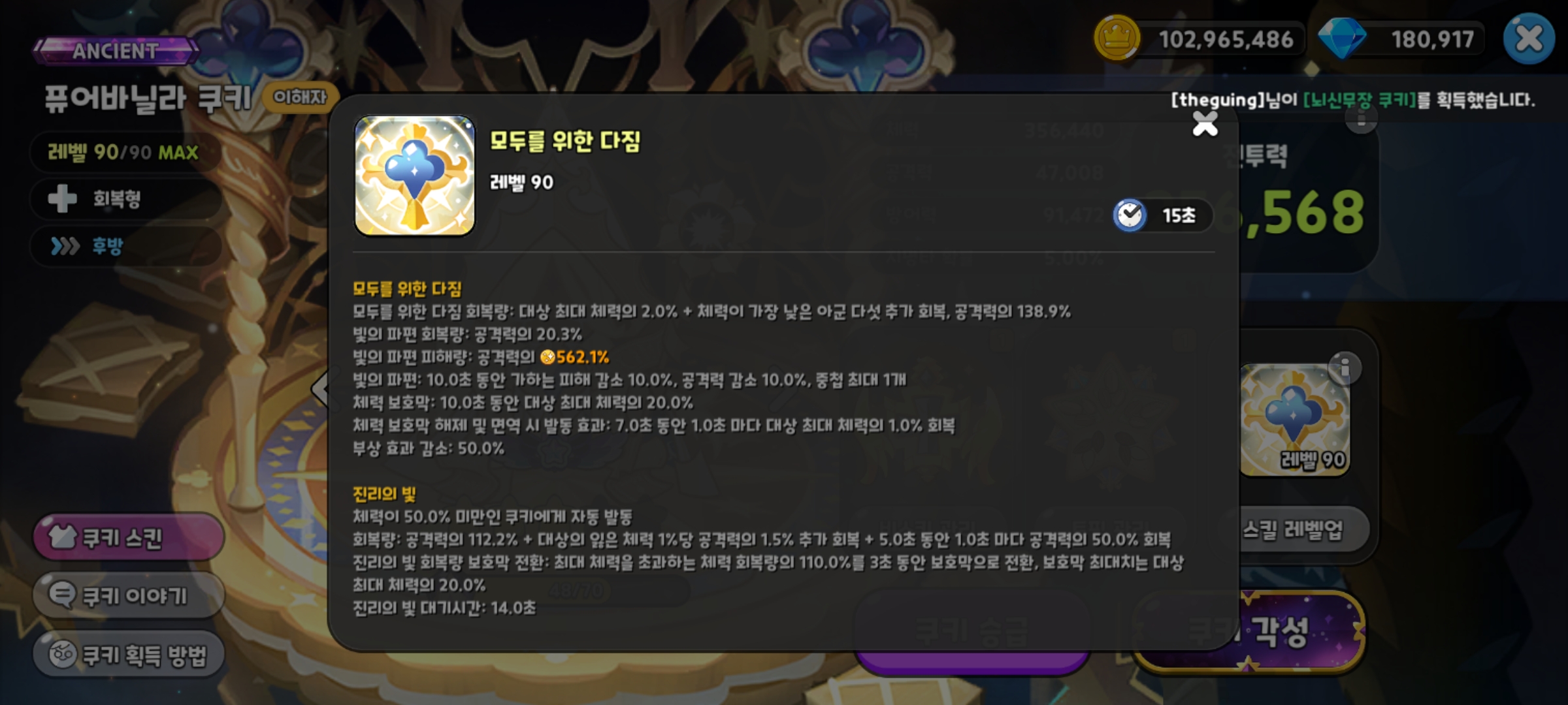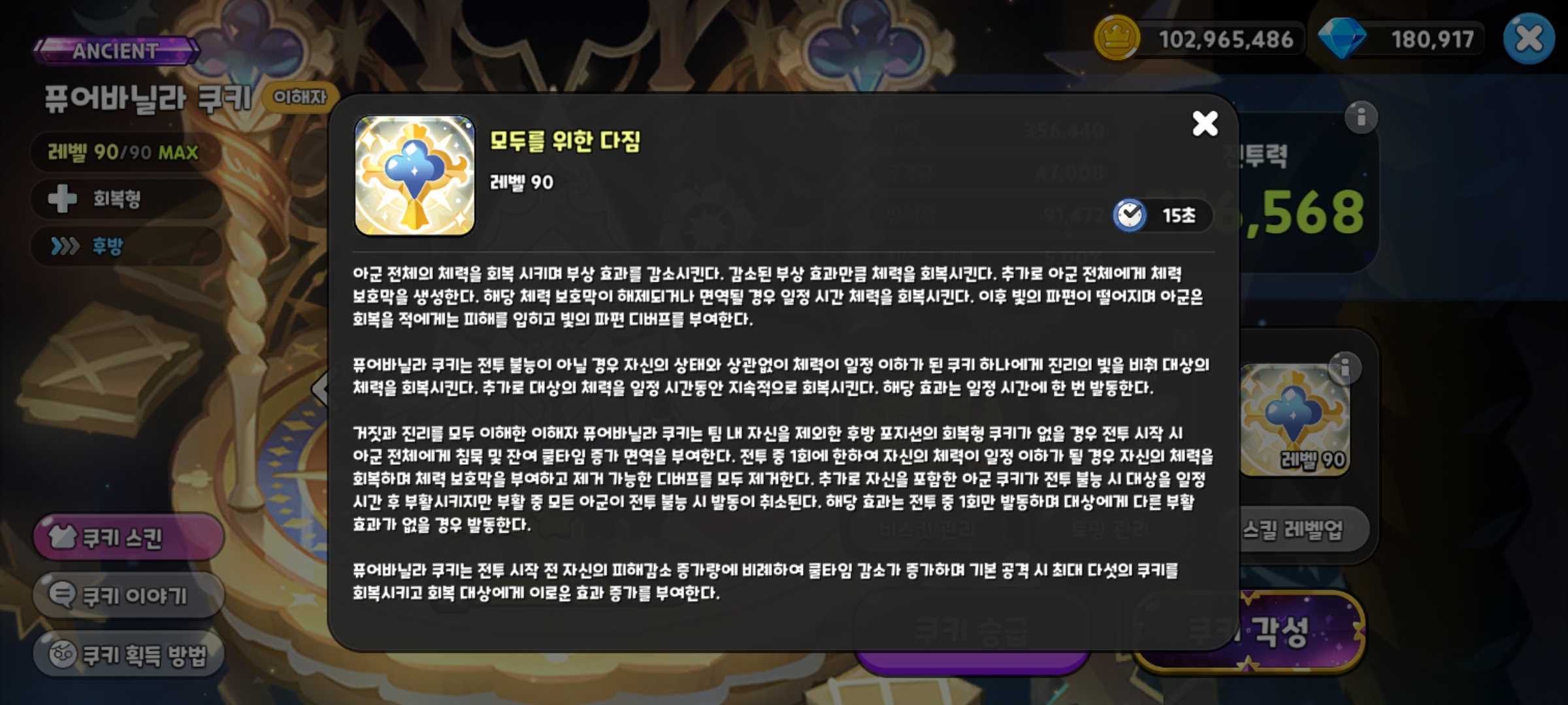 아군 쿠키 부활 : 전투 불능 쿠키 하나 7.0초 후 30.0% 해당하는 체력으로 부활