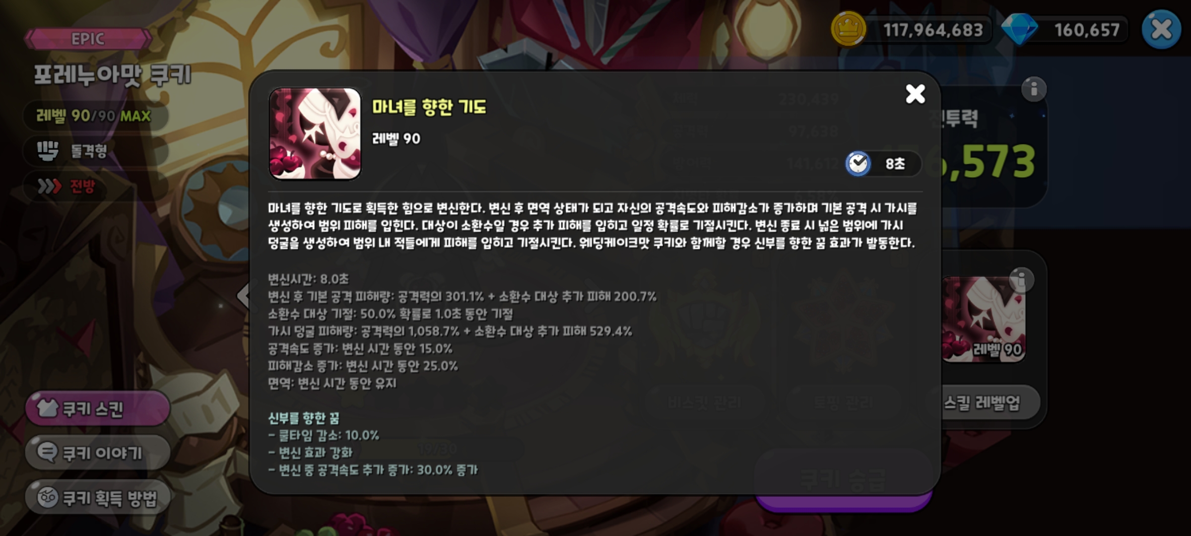 마녀를 향한 기도로 획득한 힘으로 변신한다. 변신 후 면역 상태가 되고 자신의 공격속도와 피해감소가 증가하며 기본 공격 시 가시를 생성하여 범위 피해를 입힌다. 대상이 소환수일 경우 피해를 입히고 일정 확률로 기절시킨다. 변신 종료 시 넓은 범위에 가시 덩굴을 생성하여 범위 내 적들에게 피해를 입히고 기절시킨다. 웨딩케이크맛 쿠키와 함께할 경우 신부를 향한 꿈 효과가 발동한다.