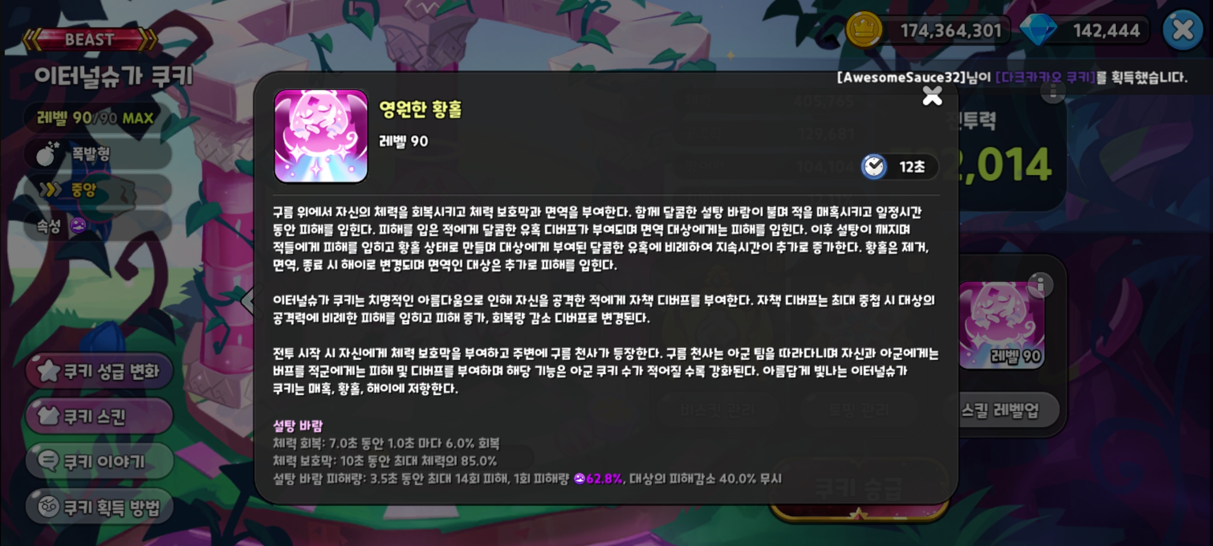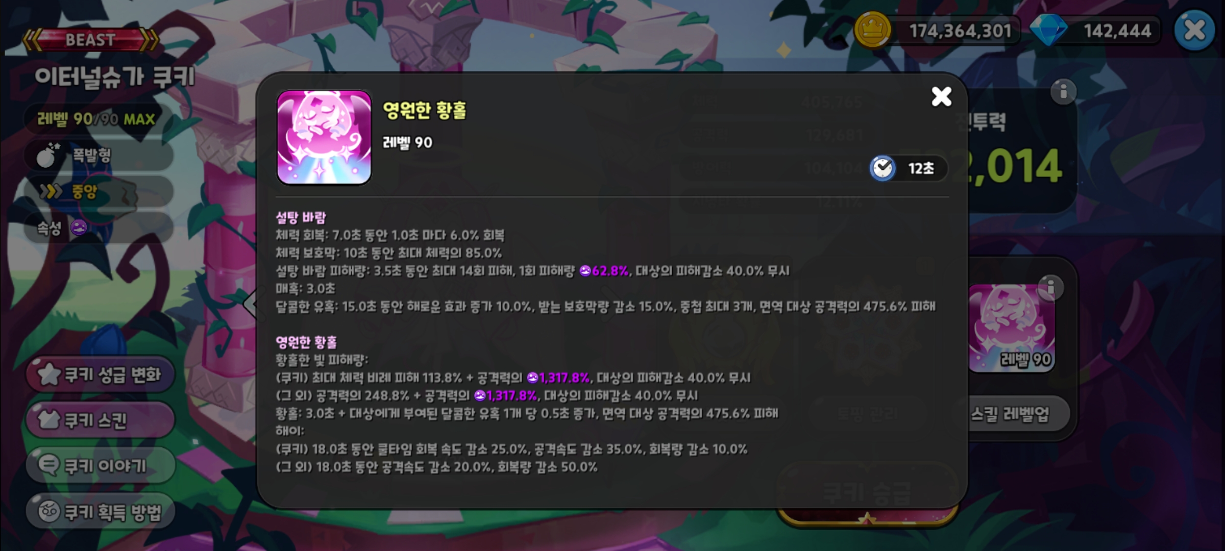 자책 최대 중첩시 피해량 : (쿠키) 공격자 공격력의 734.9%, (그 외) 이터널슈가 쿠키 공격력의 414.8%
