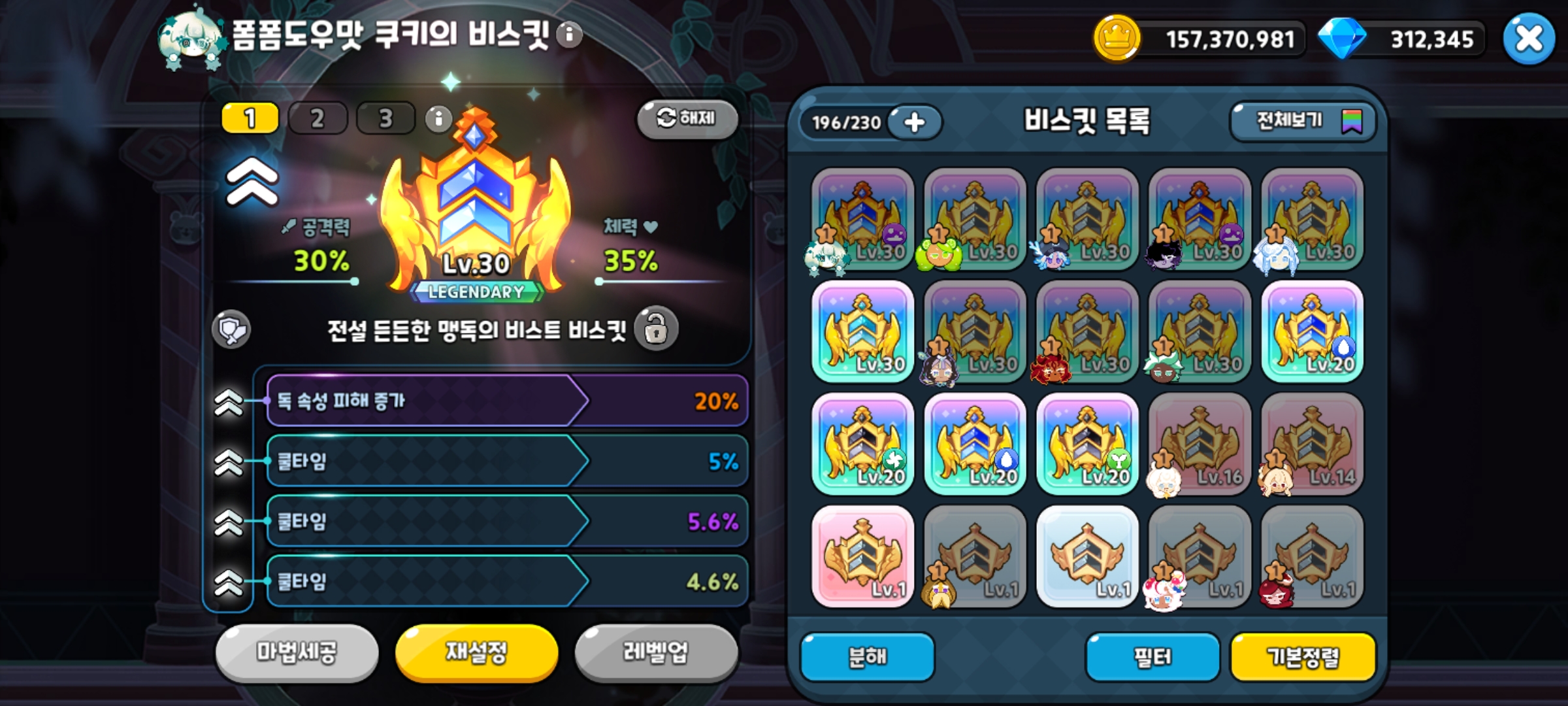 분열 폭발 피해 : 총 3회 피해, 1회 피해 공격력의 🟣22.5% 분열 폭발 중독 : 10.0초 동안 1.0초 마다 🟣67.6% 피해 곰팡이 포자 : 15.0초 동안 해로운 효과 증가 60.0% + 방어력 감소 50.0% + 받는 치명타 피해 증가 65.0%, 중첩 최대 1개 중독 피해 증가 : 15.0초 동안 중독 피해 10.0% 증가, 중첩 최대 1개 폼폼 탈출 : 폼폼도우맛 쿠키 체력 15.0% 도달 시 발동, 최대 체력 50.0% 회복 + 스킬 쿨타임 감소 5.0초 용언 낙인 : 현재 체력의 8.0% 체력 피해, 스킬 쿨타임 감소 1.0초, 발동 주기 12.0초
