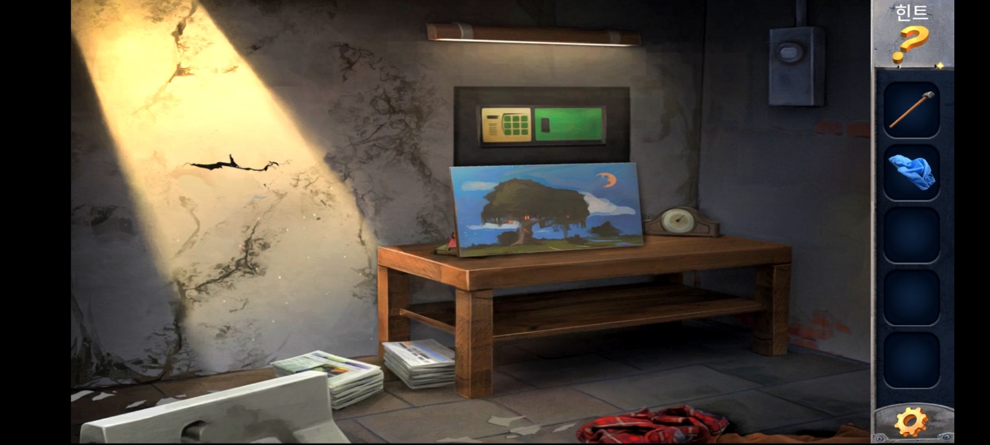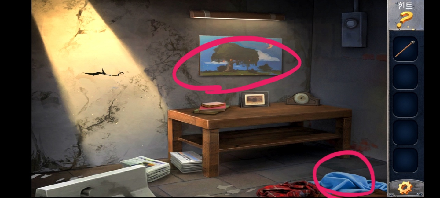들어와서 바닥의 천을 줍고 그림을 눌러 놓자