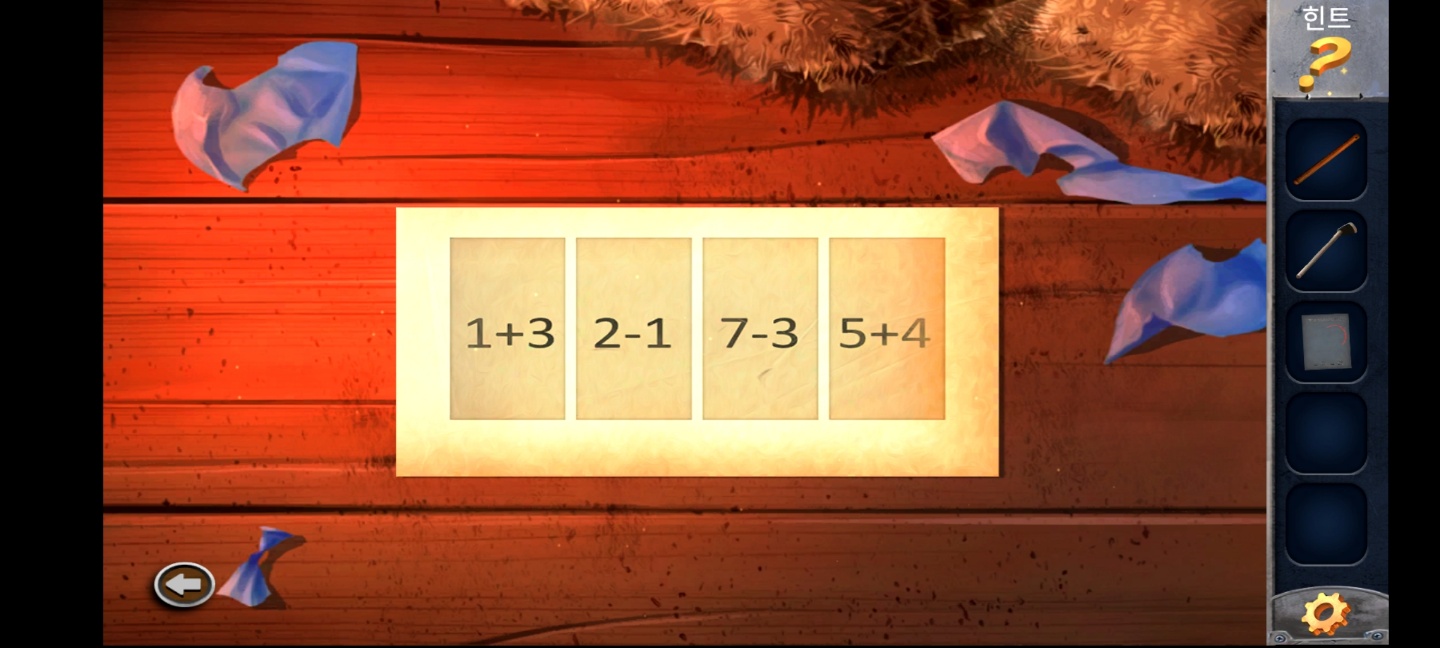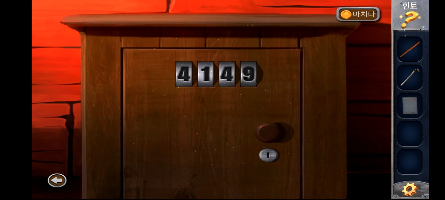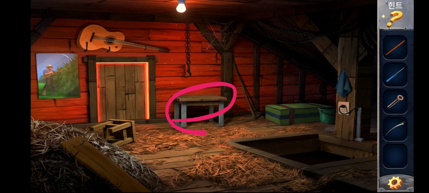 들어와서 벽에 있는 갈퀴 손잡이 부분을 여러번 눌러 나무 막대기를 얻고