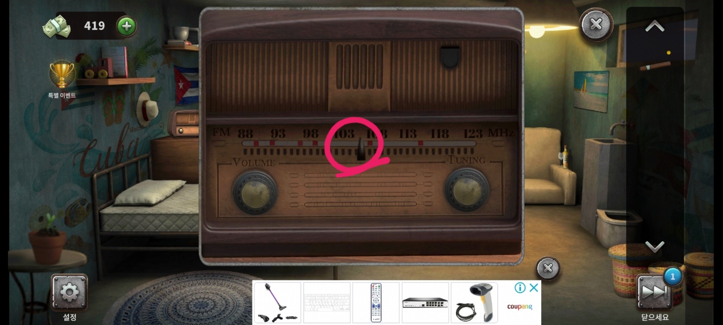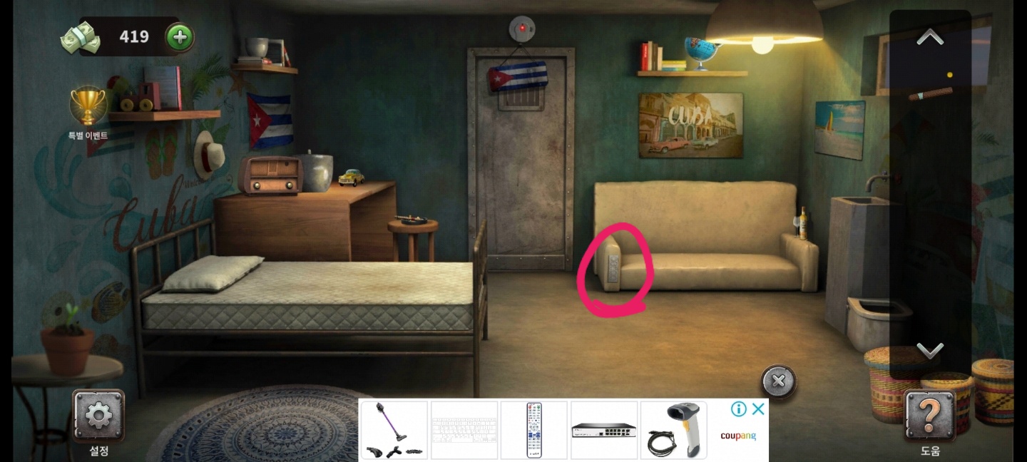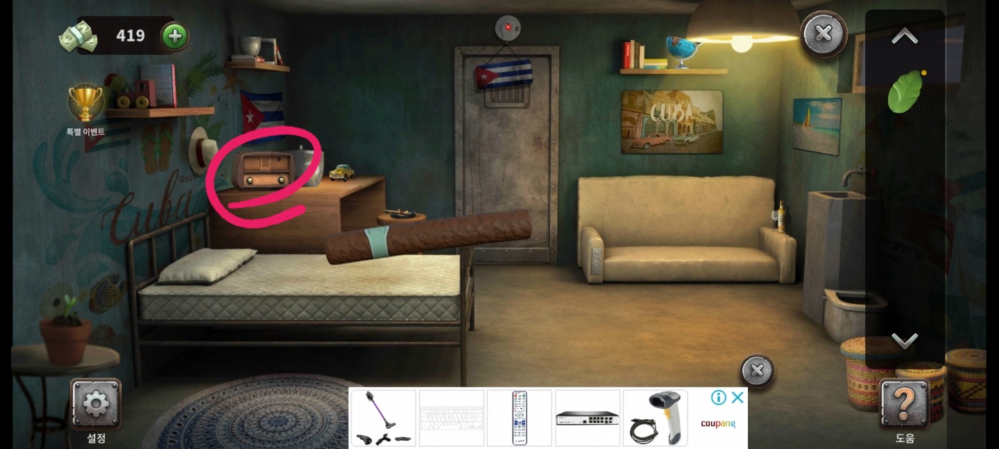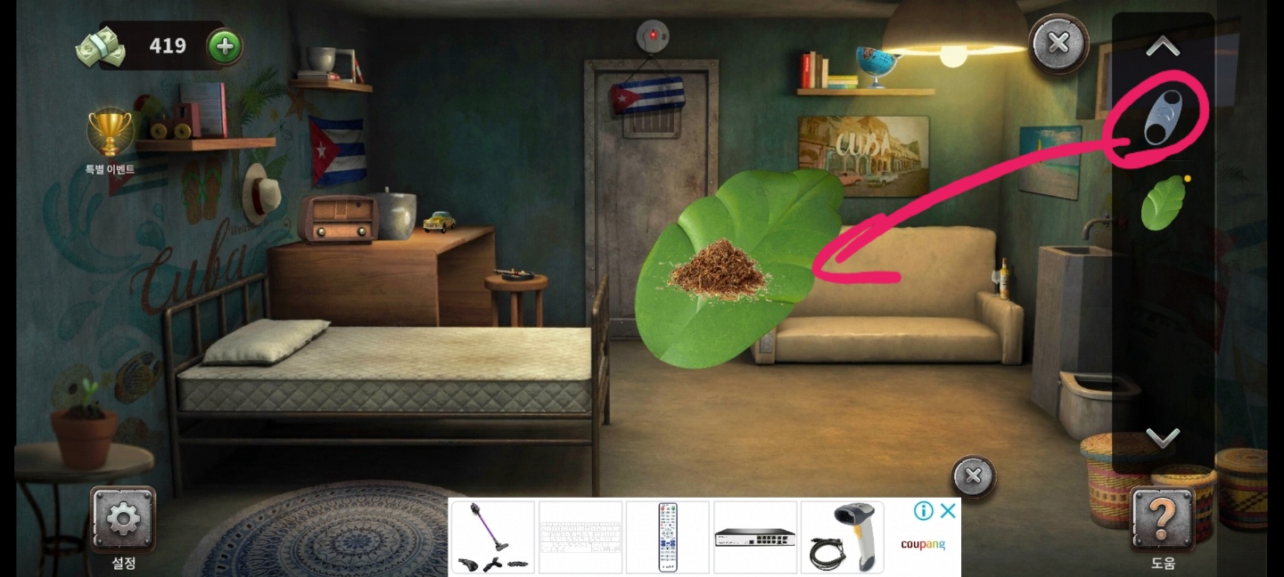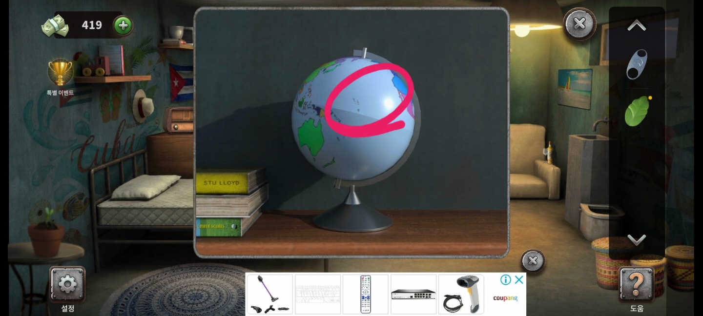 침대위의 절단기, 화분의 잎을 얻고 지구본을 클릭하자